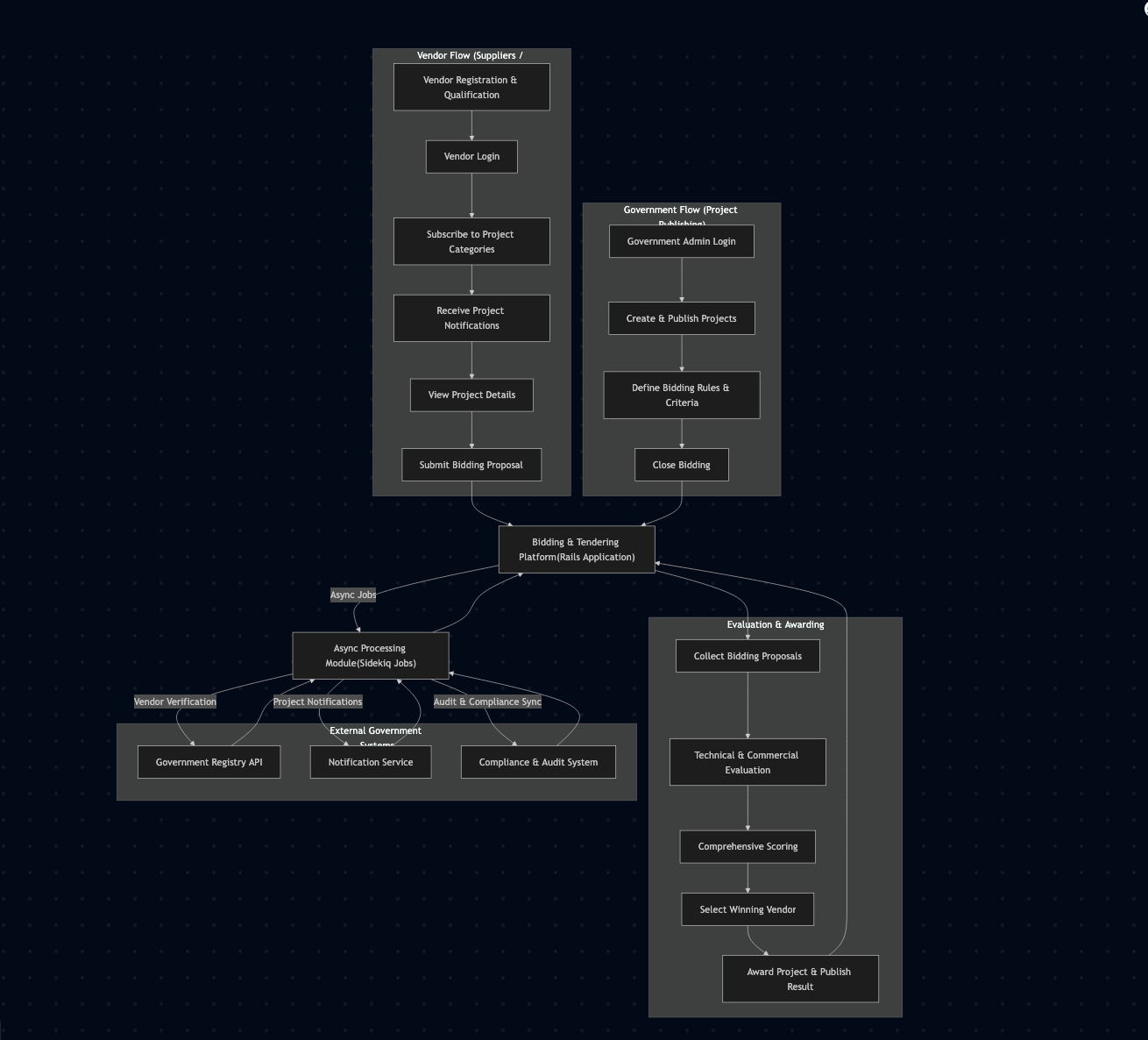 The platform consisted of two major systems: - A Government Procurement Platform for standardized goods purchasing - A Bidding & Tendering Platform for public project announcements and supplier competition