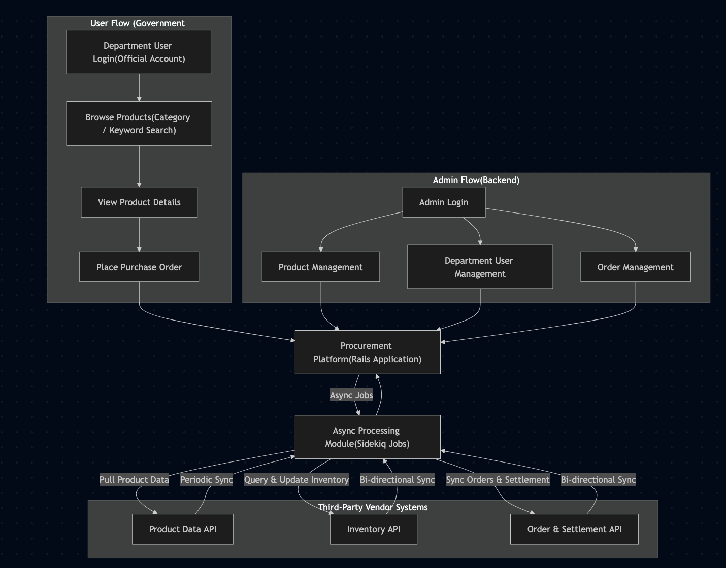 Admin Flow (Backend Management): 1. Administrators log into the management system 2. Manage: - Products - Department users - Orders 3. All management modules integrate with third-party vendor APIs to ensure: - Product data synchronization - Inventory query and updates - Order status synchronization - Financial settlement updates